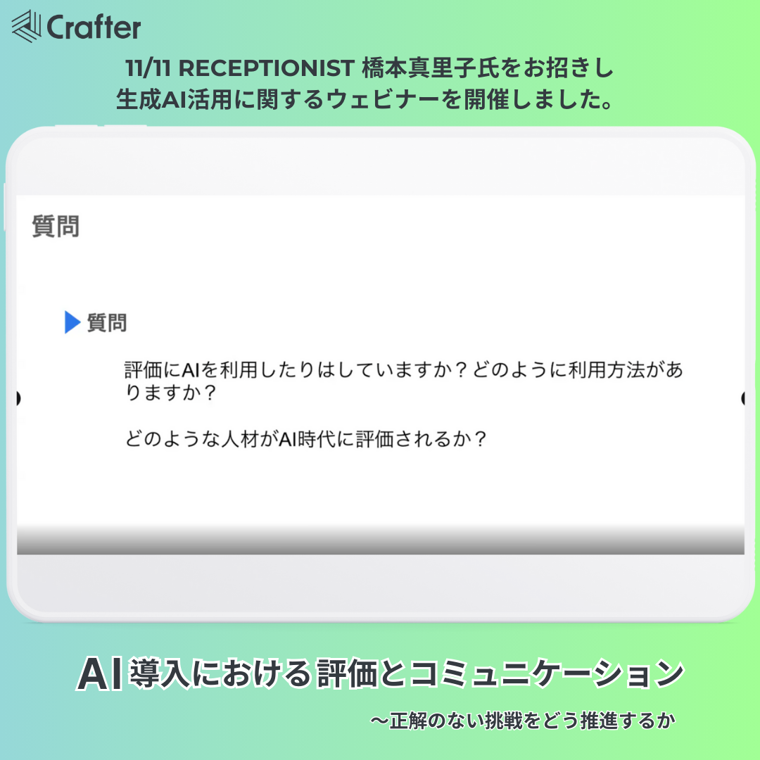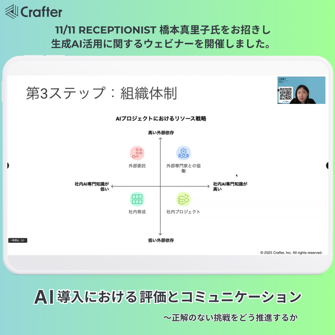 2025年11月11日(火)、株式会社RECEPTIONIST 代表取締役兼代表執行役員CEO 橋本真里子氏をお招きし、オンラインイベント「AI導入における評価とコミュニケーション 〜正解のない調整をどう推進するか〜」を開催しました。